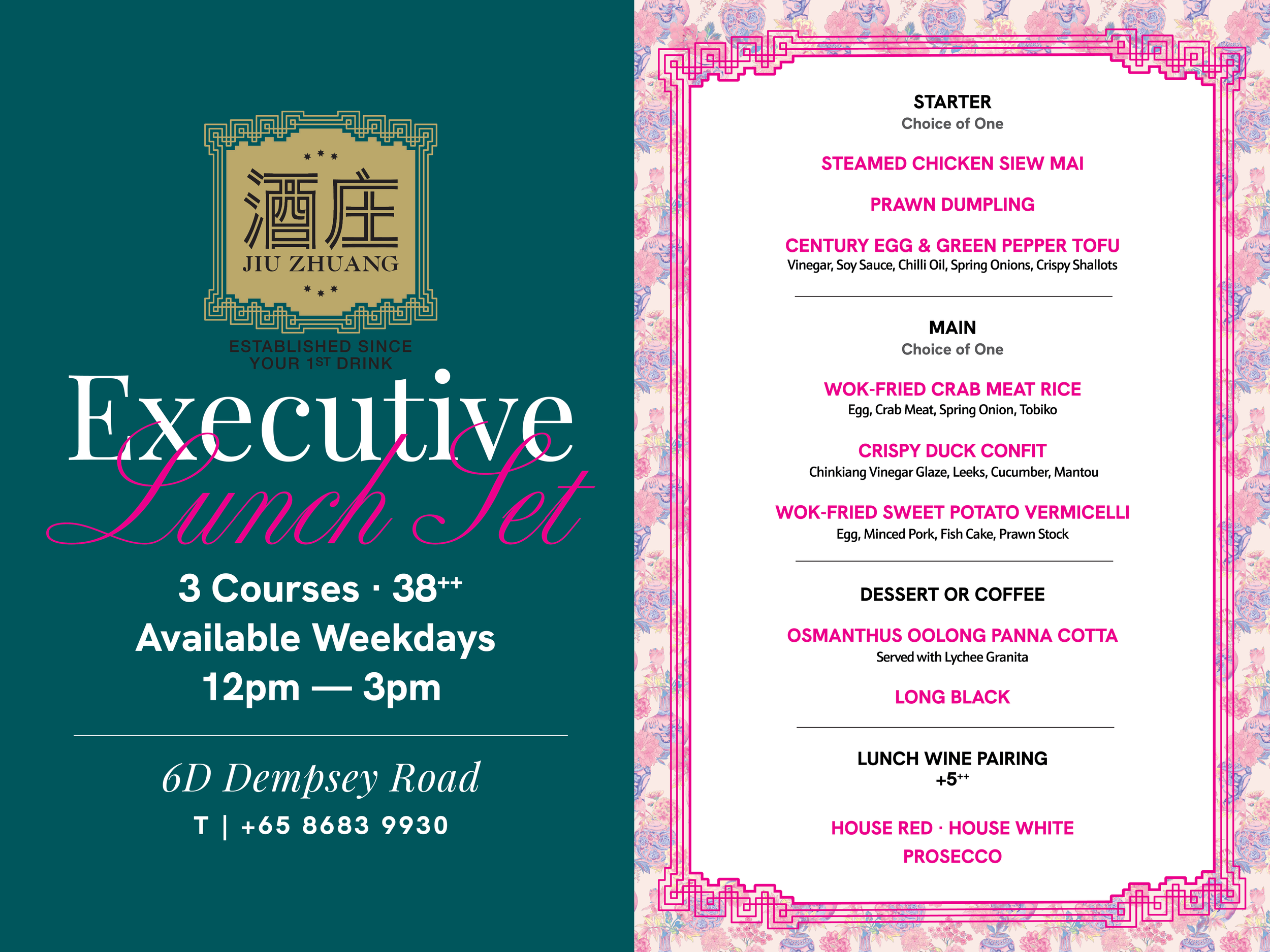 Set in the lush greenery of Dempsey, 酒庄 JIU ZHUANG’s Weekday Set Lunch offers a refined escape for business lunches and leisurely afternoons. A thoughtfully curated 3-course menu at 38++, available weekdays from 12pm to 3pm. Book a Table Today: www.jiu-zhuang.com/rsvp